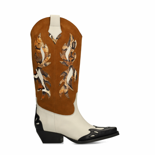Diese cognacfarbenen Cowboystiefel der Marke Sacha haben eine spitze Kappe, eine edle Zierstickerei, Animalprint-Details und schwarz-weiße Akzente. Bei einem Modell in Größe 37 beträgt die Schafthöhe 27 cm und der Schaftumfang 34 cm. Der Blockabsatz hat eine Höhe von 5 cm. Die Western Boots sind vollständig aus Leder gearbeitet.