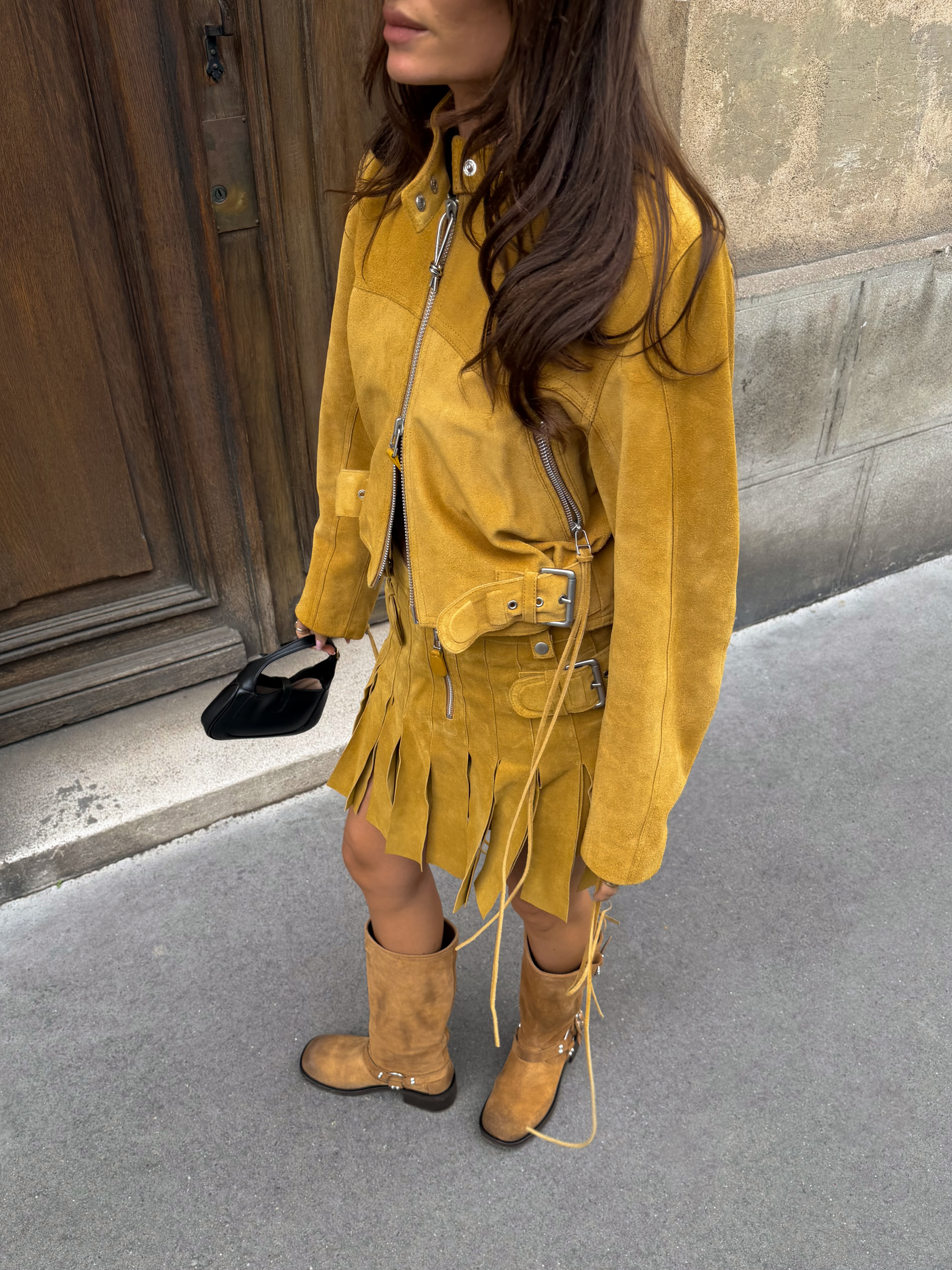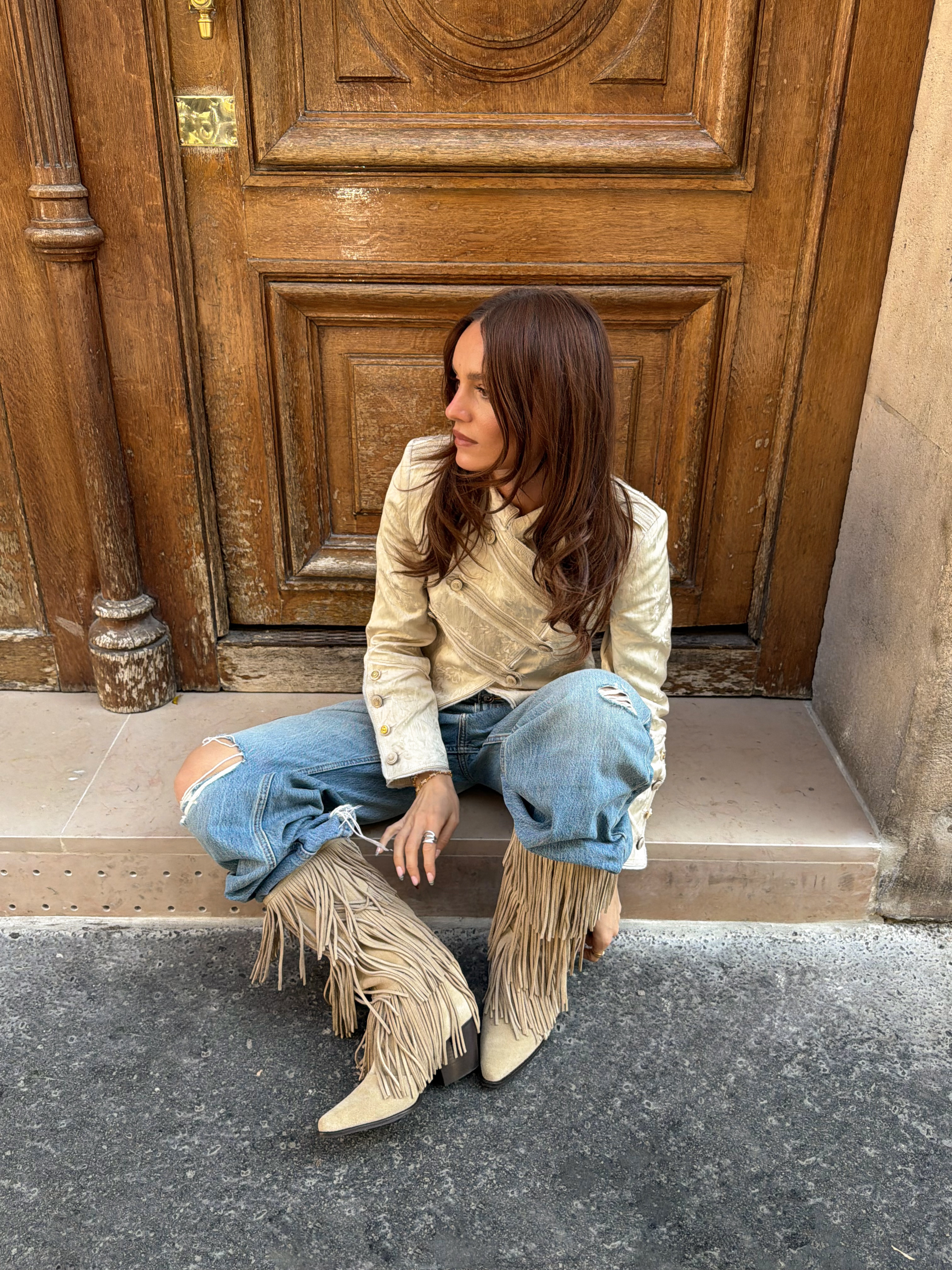Festival Fashion lebt von Gefühl und Bewegung – und genau dazu passen Boots mit Fransen und soften Materialien perfekt. Der Look wirkt träumerisch und bohemian, mit Fokus auf Flow und Dynamik. Suede spielt dabei eine Hauptrolle: weich, natürlich und mit Fransen, die bei jedem Schritt mitschwingen. Kombiniere die Boots mit einem entspannten, bewusst gestylten Look – zum Beispiel mit Capri, Lederjacke und einem Basic White Tee. Das Zusammenspiel aus Texturen und Layering verleiht deinem Outfit Tiefe und lässt es lebendig wirken.