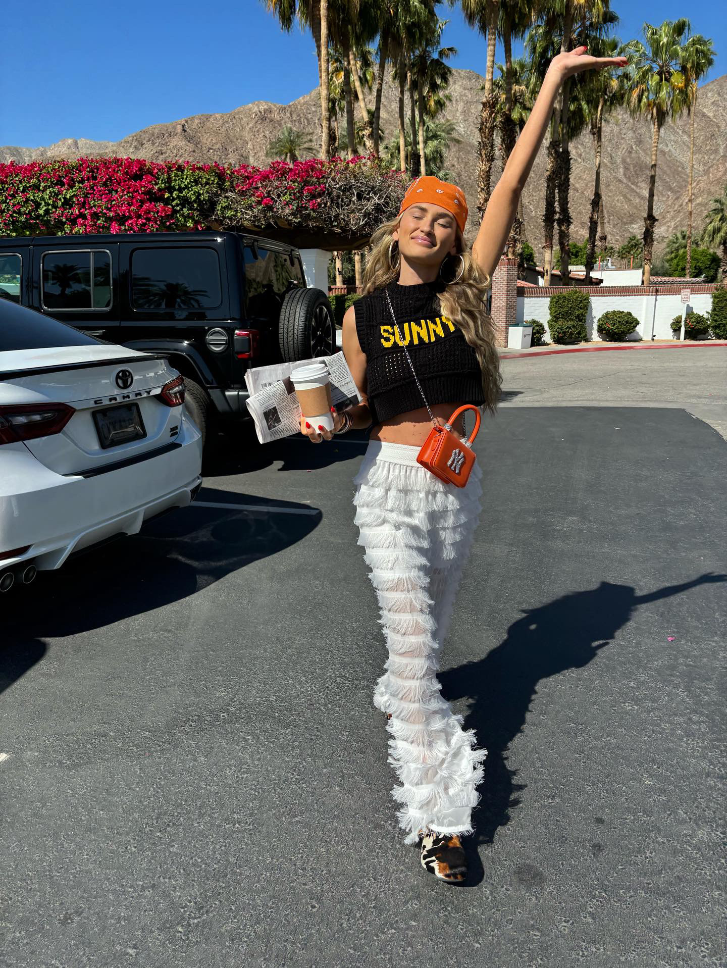 Trending Girl @tessavmontfoort rockt unsere Clogs mit Kuhmuster zu einem stylishen Festival Look. Kombiniere die Clogs mit einer weiten Hose, einem kurzen Häkeltop und fertig ist ein beachy Festival-Outfit.