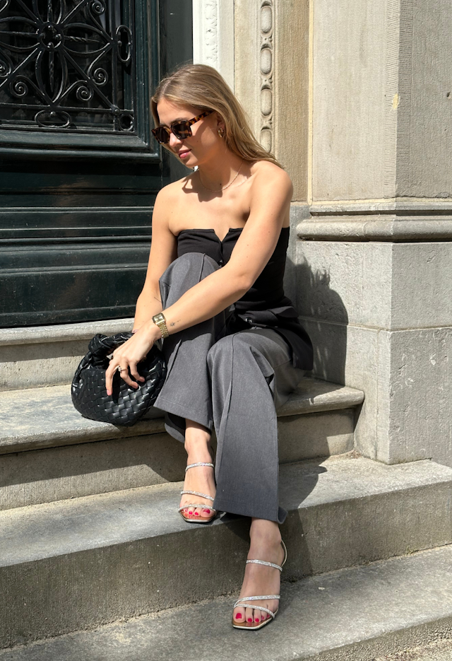 Ein sophisticated Sommer-Outfit by @femkevermaas. Kombiniere unsere Statement-Sandalen mit Strass mit einer weiten Stoffhose, einem enganliegenden Off-Shoulder-Top und gib dem Look mit einer schwarzen Handtasche den Finishing Touch. Der perfekte Summer Style − classy & sophisticated!