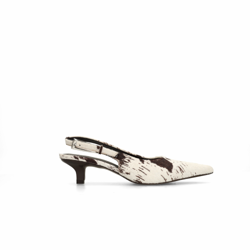 Hinweis: Es handelt sich bei diesem Artikel um eine Vorbestellung. Voraussichtliche Lieferzeit: Mitte Oktober. Diese stylishen Slingbackpumps der Marke Sacha haben einen 5 cm hohen Trichterabsatz, eine spitze Kappe und eine Pony Hair-Optik mit Kuhfellmuster. Die Innenseite der Schuhe ist aus Leder gearbeitet.